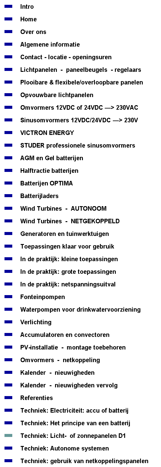 INLEIDING Met lichtpanelen kan men zonlicht omzetten in elektriciteit. Dit proces noemen we het fotovoltaïsch effect. Een paneel bestaat uit meerdere zonnecellen die met elkaar verbonden zijn door geleiders. Elk zonnecel is opgebouwd uit halfgeleidend materiaal. Onder invloed van het licht ontstaat een electrische stroom. Het vermogen van een PV-systeem wordt uitgedrukt in Wp of kWp (kilowattpiek). Dit is het vermogen dat een PV-systeem levert bij een lichtinstraling van 1.000W/m². Het varieert tussen 50W per m2 voor amorf silicium en 170 W per m2 voor monokristallijn silicium zonnecellen met hoog rendement. Een PV-systeem met een vermogen van 1 kWp in polykristallijn silicium zonnecellen heeft een paneeloppervlakte van ongeveer 8m² en produceert ongeveer 800 kWh/850kWh elektriciteit per jaar. Een PV-systeem met een vermogen van 1kWp in monokristallijne cellen heeft een paneeloppervlakte van ongeveer 6,7m² en produceert ongeveer 900kWh/1.100kWh elektriciteit per jaar. De omgezette zonne-energie kan bijvoorbeeld met behulp van een controller/laadregelaar een accu opladen. Op deze accu kan men verbruikers aansluiten of de accuspanning met een spanningsomvormer omzetten naar de gekende 230V spanning. Een andere toepassing is de stroom terug te sturen naar het elektriciteitsnet via een inverter/netkoppelaar welke op zijn beurt op het elektriciteitsnet aangesloten wordt.